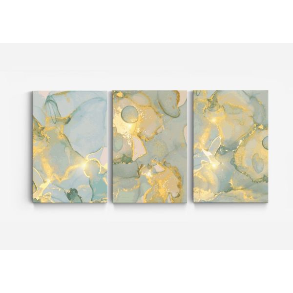 Este impresionante lienzo abstracto presenta tonos vibrantes de oro y azul verdoso, aportando un toque de elegancia a cualquier habitación. Los intrincados patrones crean un efecto hipnotizante, perfecto para interiores modernos. Ideal para salas de estar o dormitorios, este producto contiene un conjunto de 3 lienzos solamente.