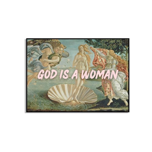 Este impresionante póster presenta la famosa pintura El nacimiento de Venus de Sandro Botticelli con la frase 'Dios es una Mujer'. Es una combinación de arte clásico y empoderamiento feminista moderno. Ideal para amantes del arte y aquellos que aprecian declaraciones audaces. El producto contiene solo un póster.