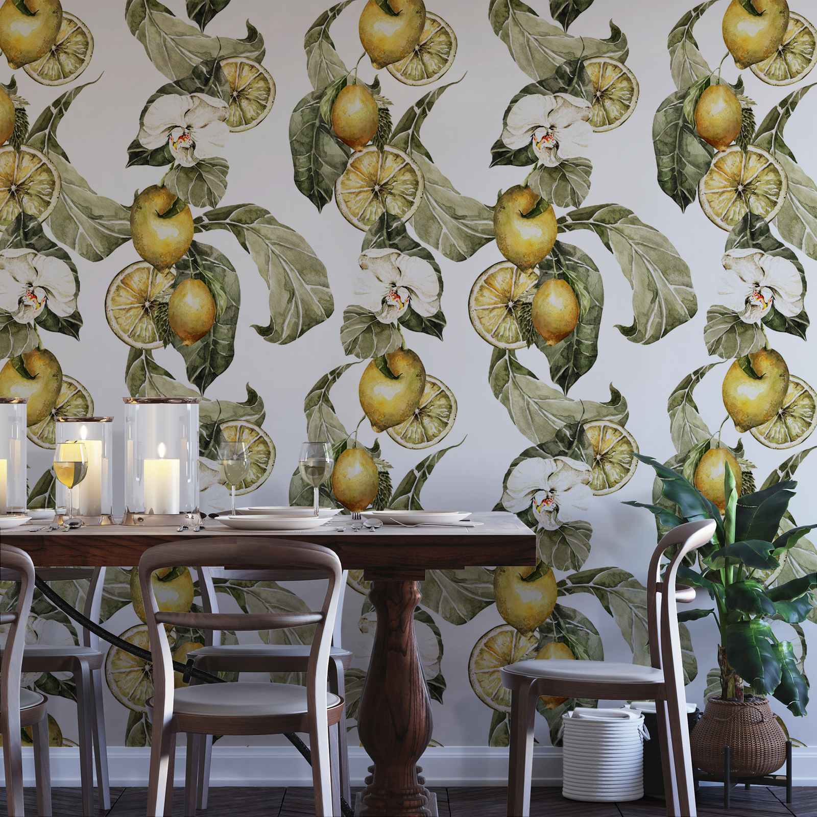 Este papel pintado elegante presenta un diseño vívido de limones y hojas verdes exuberantes, perfecto para agregar un toque de naturaleza a su espacio. El detallado intrincado aporta una sensación botánica refrescante a cualquier habitación. Ideal para salas, comedores o cualquier espacio que necesite un levantamiento alegre y luminoso.