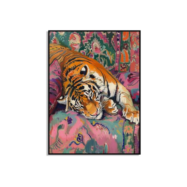 Este póster de arte vibrante muestra un tigre descansando contra un fondo colorido. Perfecto para agregar un toque salvaje a tu decoración del hogar. El producto contiene un solo póster.
