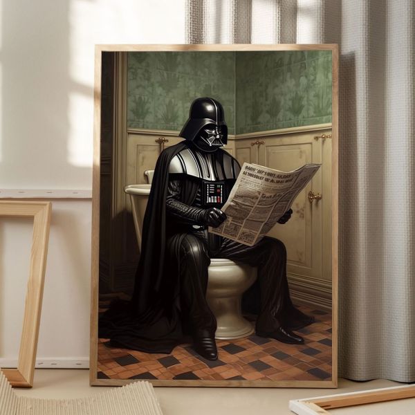 Este póster de pared único presenta a Darth Vader leyendo un periódico en un entorno de baño. Una pieza de arte intrigante para cualquier fan de Star Wars. Perfecto para agregar un toque humorístico a la decoración de tu hogar. El producto contiene un solo artículo.