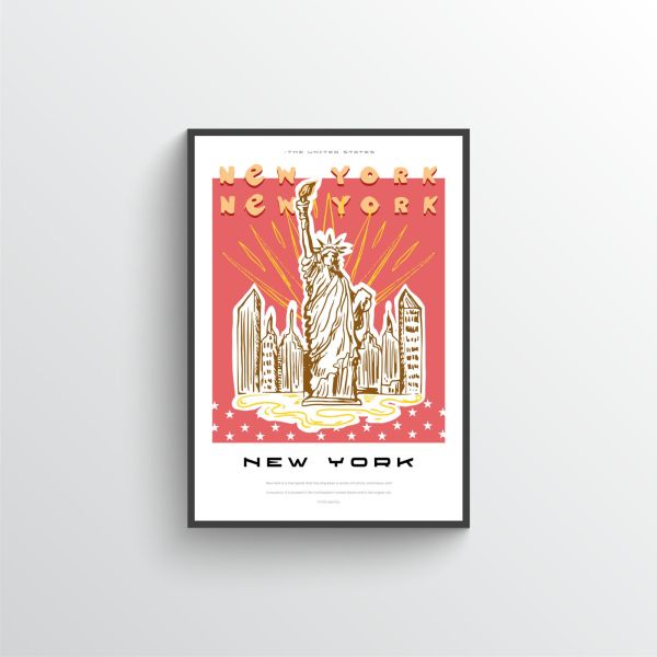 Póster de la ciudad de Nueva York con la icónica Estatua de la Libertad y el skyline. Texto: New York, New York. Incluye texto informativo sobre el horizonte de la ciudad. El producto contiene un solo póster.