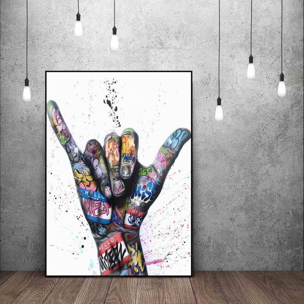 Este vibrante póster de pared presenta una mano cubierta de arte graffiti colorido, creando una pieza de decoración moderna impresionante. El texto destacado incluye frases como 'HELLO', 'LOVE' y más. El producto contiene un póster único.