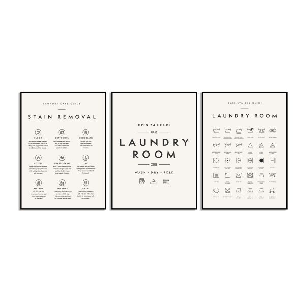 Mejora tu lavadero con estos pósters informativos y elegantes. El set incluye una guía de eliminación de manchas, una guía de símbolos de lavandería y un cartel de lavandería abierta las 24 horas. Perfecto para cualquier espacio de lavadero para agregar tanto decoración como funcionalidad. El texto destacado incluye 'Stain Removal', 'Laundry Room' y 'Laundry Guide'. El producto contiene solo un conjunto de 3 pósters.